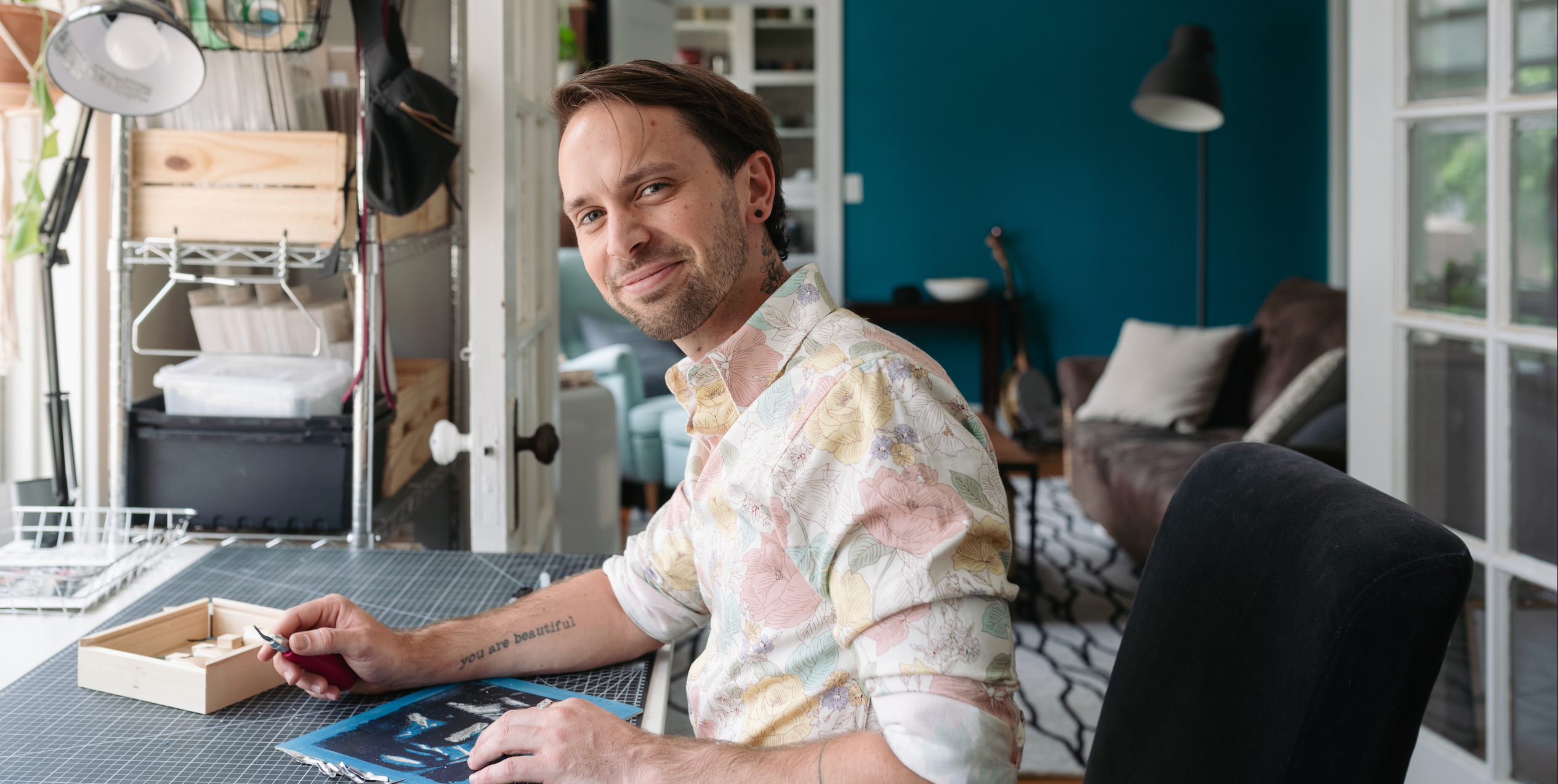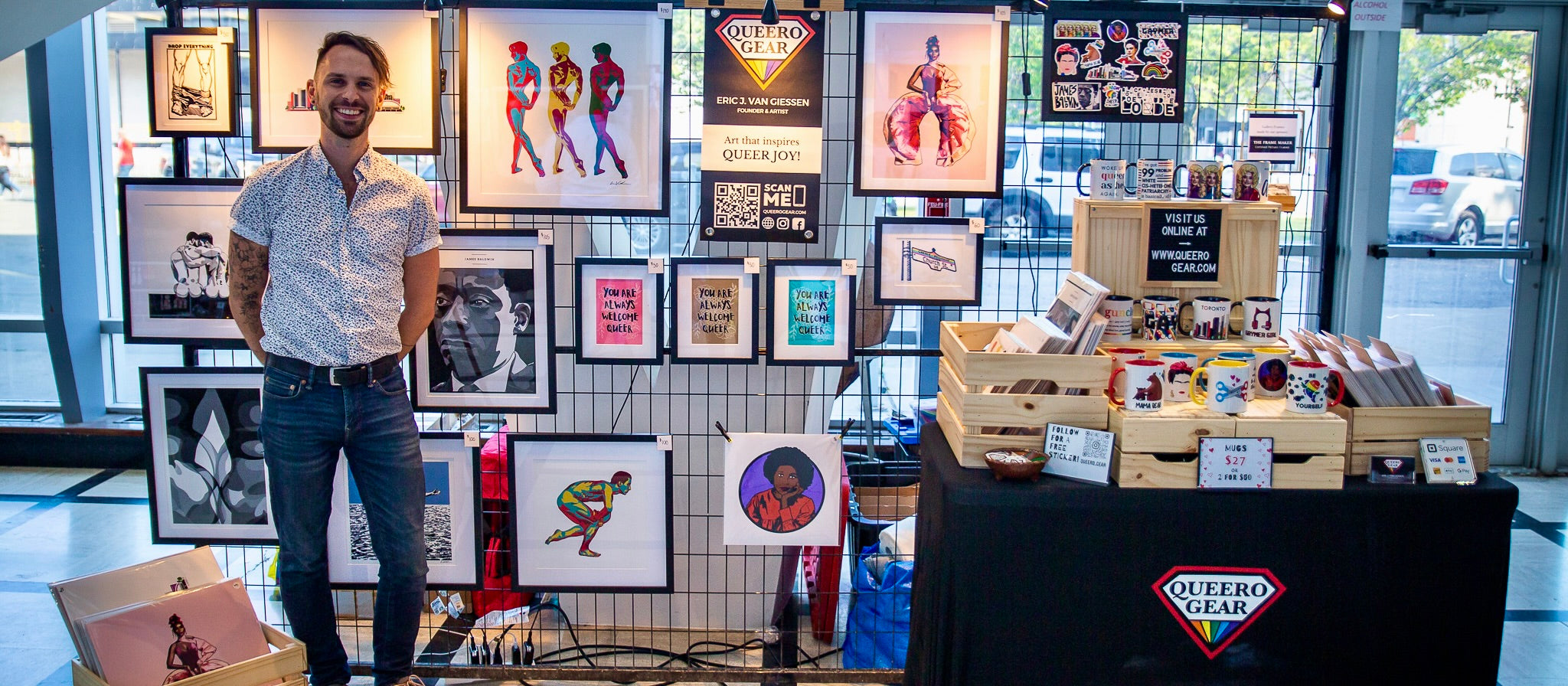 Hi! I'm Eric J. Van Giessen (he/they), I'm an artist, scholar, poet and the founder of Queero Gear. My full-time gig is as a doctoral student studying sociology at York University using arts-based methods to research lived experiences of queer religiosity.