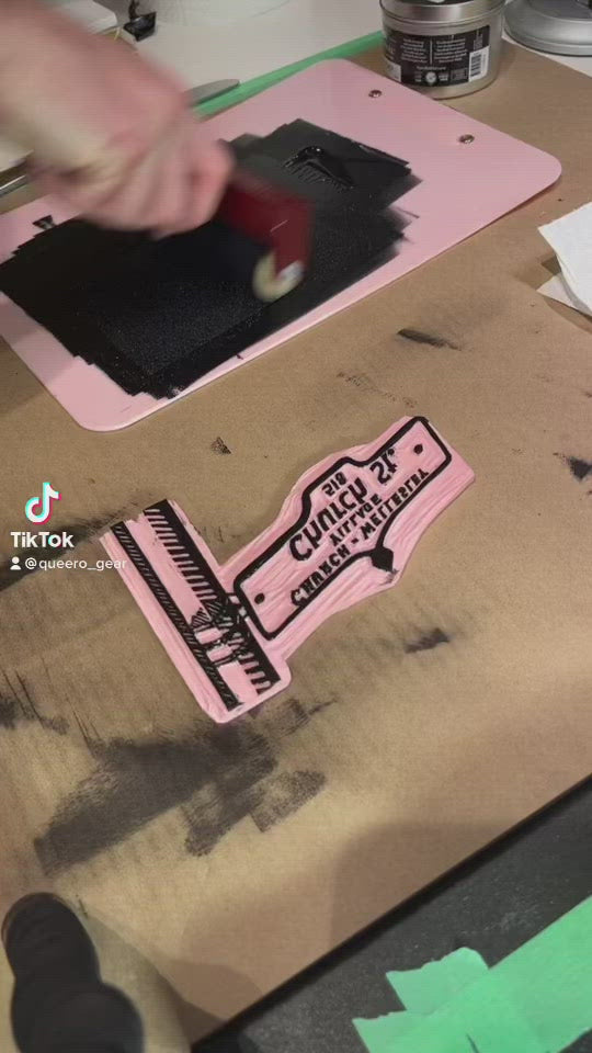 A handmade, original, limited edition linocut print entitled, "Church St." features a rainbow-clad street sign from The Village in Toronto, ON.