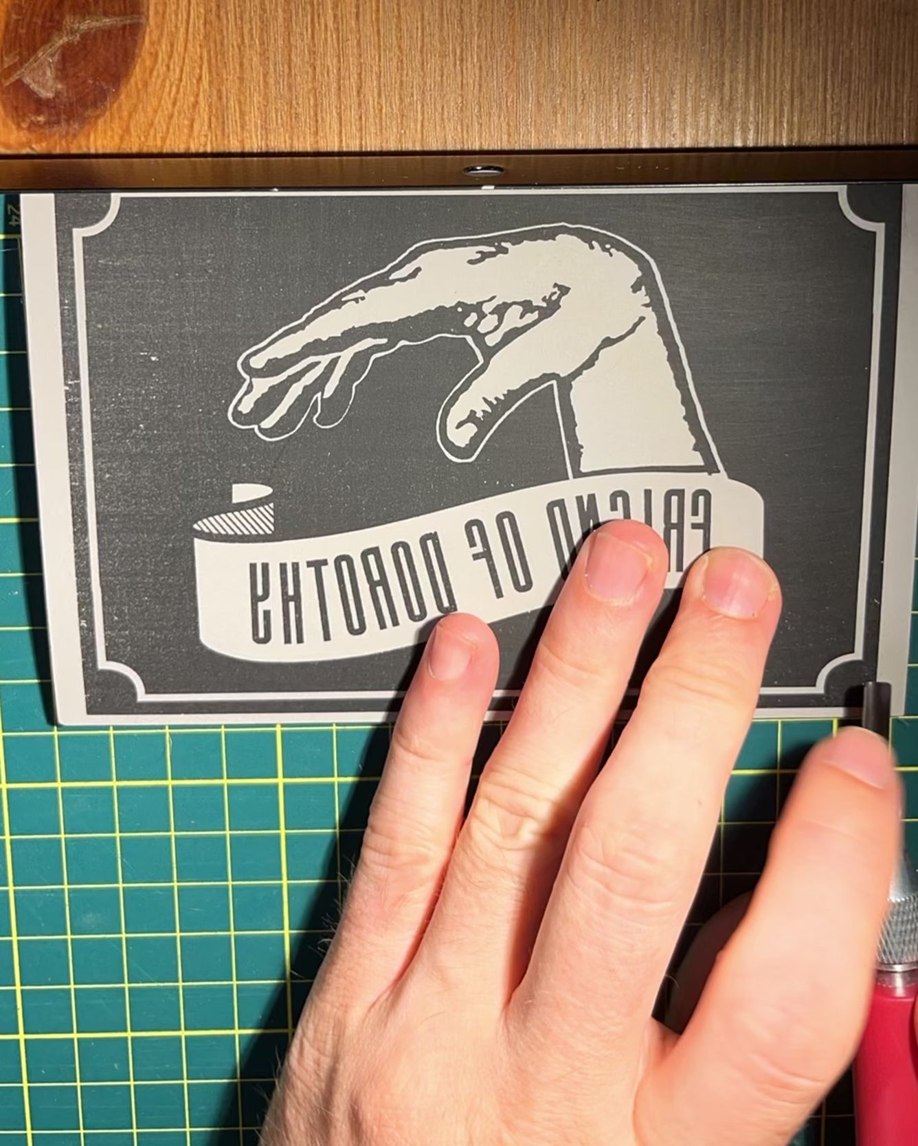 A handmade, original, open edition linocut print entitled, "Friend of Dorothy." This simple bold print features a banner with the text "FRIEND OF DOROTHY" backgrounded by a limp wrist. Historically, the phrase "Friend of Dorothy" was used as a covert way to identify another member of the LGBTQ+ community. Though the origins of the term are debated, many people believe it has to do with gay icon Judy Garland's role as Dorothy in the Wizard of Oz, or else due to the myriad queer themes found in L. Frank Baum novel The Wonderful Wizard of Oz.