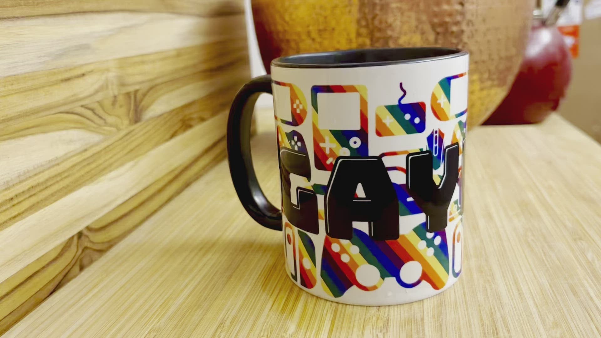 The video GAYmer in your life is sure to love this mug featuring a pattern of rainbow video game controllers and the word “GAYMER” in a funky font across the side. Show the GAYmer in your life some love with this pride flag rainbow coloured GAYMER mug. Got a gay brother or friend who loves video games? Get him/her/them this mug to start their day every day reminded of how much you care!