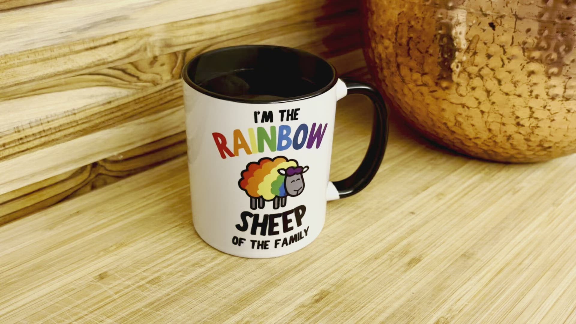 This delightful rainbow coffee mug is sure to make your gay, lesbian, or bisexual friend or family member smile. Makes a wonderful birthday or Christmas gift! The illustrated design is on both sides of the coffee mug, and the inside and handle are filled with the color of your choice: black, red, blue or yellow!
