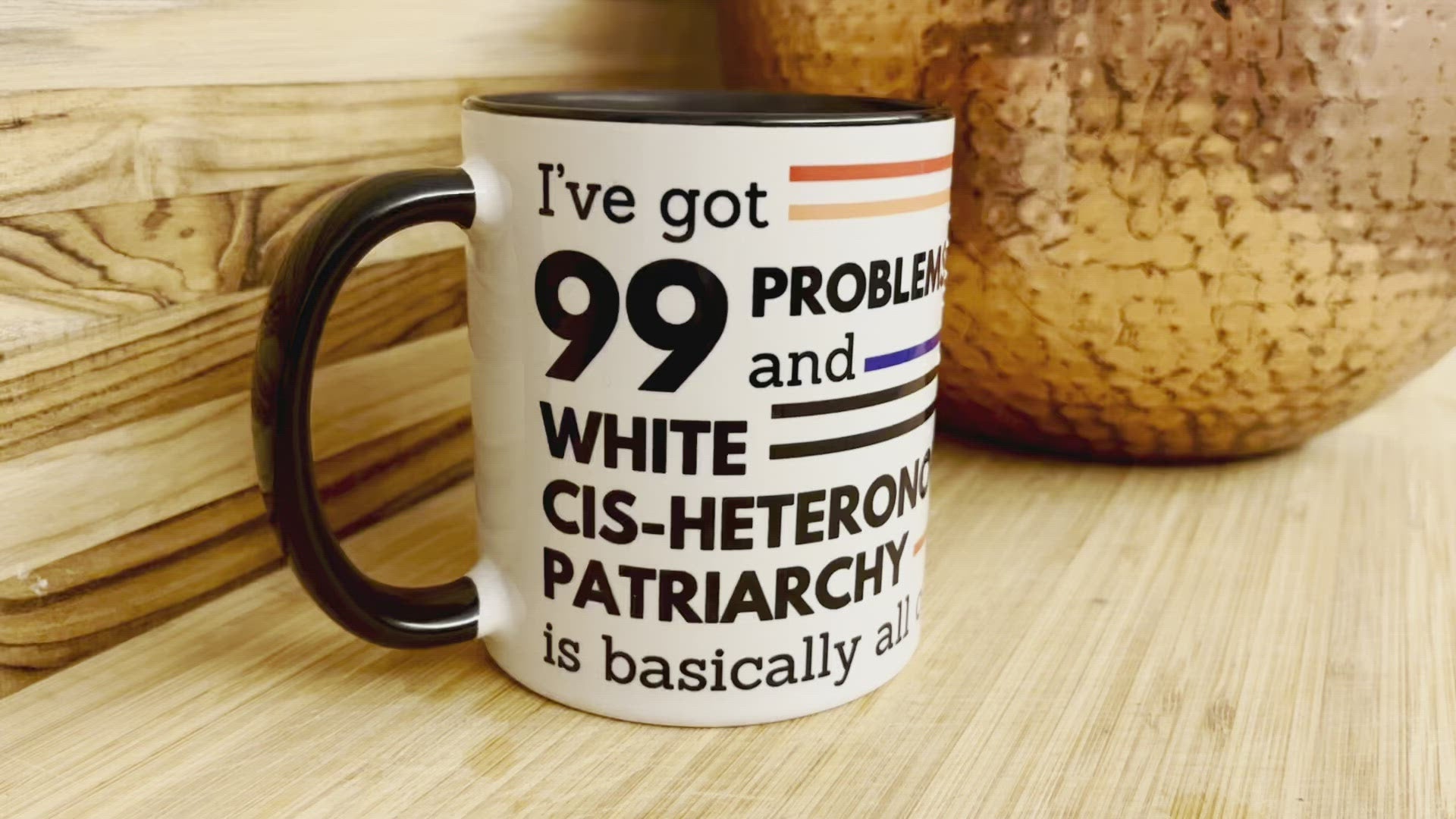 This LGBTQ+ feminist mug with rainbow design features the phrase 'I've Got 99 Problems and White Cis-Heteronormative Patriarchy is Basically All of Them'. Makes a great LGBTQ Pride or Christmas gift for feminists of all stripes!